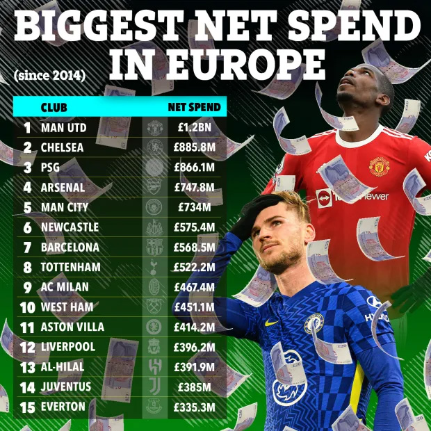Theo số liệu từ CIES, Chelsea đứng thứ hai trong danh sách này với mức chi tiêu ròng đạt 885 triệu bảng, trong đó chỉ tính riêng trong năm 2023, con số này của The Blues đã là 558 triệu bảng. Một thống kê đáng buồn với giải đấu số 1 xứ sương mù, đó là trong số 10 CLB chi tiêu ròng nhiều nhất kể từ năm 2014 thì có đến 7 cái tên thuộc Premier League. Arsenal đứng thứ 4 với mức chi tiêu ròng đạt 747.8 triệu bảng, theo sau là Man City (734 triệu bảng) và Newcastle (575.4 triệu bảng), trong khi Tottenham (522.2 triệu bảng) đứng thứ 8 và West Ham (451.1 triệu bảng) xếp thứ 10.