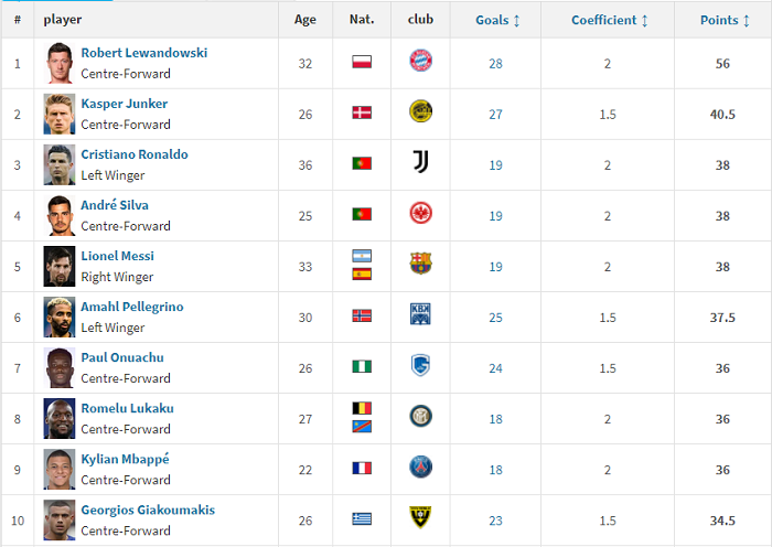 Xếp trên Ronaldo và Messi là Kasper Junker và Robert Lewandowski. Kasper Junker đã ghi tới 27 bàn thắng tại giải VĐQG Đan Mạch mùa 2020/21. Tuy nhiên, do giải VĐQG Đan Mạch chỉ được tính hệ số 1.5 nên Kasper Junker mới có 40.5 điểm.
