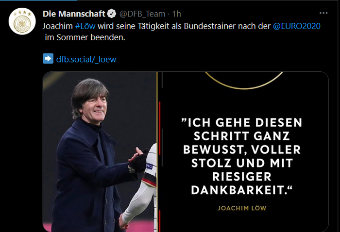 DFB đã chấp thuận yêu cầu từ phía HLV Joachim Loew. Điều này đồng nghĩa với việc DFB phải tìm một HLV trưởng mới cho ĐT Đức sau khi vòng chung kết EURO 2020 hạ màn.