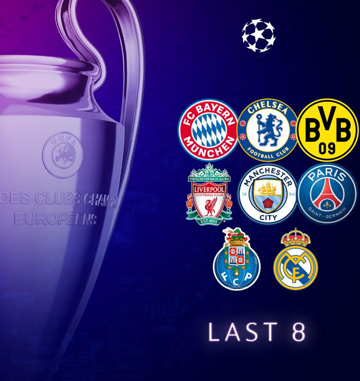 Danh sách 8 đội tham dự vòng tứ kết Cúp C1 châu Âu/Champions League 2020/21: Chelsea, Man City, Liverpool, Bayern Munich, Dortmund, PSG, Real Madrid và Porto.