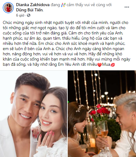 Trên trang cá nhân, bạn gái Dianka Zakhidova đã gửi tới Bùi Tiến Dũng những lời chúc ý nghĩa bằng tiếng Việt nhân sinh nhật lần thứ 24 của thủ môn gốc Thanh Hóa.
