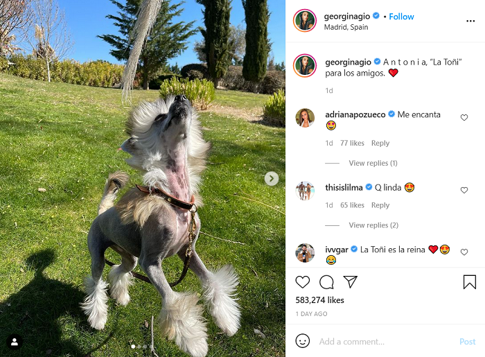 Trong hình ảnh mà Georgina Rodriguez đăng tải trên trang Instagram cá nhân, Antonia đang vui chơi dưới ánh nắng. Đây là giống chó có gốc gác từ Trung Quốc, có mào và lông ở 4 chân cùng phần đuôi nhưng toàn thân thì không có bất kỳ sợi nào.