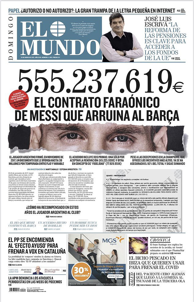 Nguồn tin từ El Mundo cho hay: tính từ tháng 11/2017 tới tháng 6/2021, Barcelona phải trả cho Lionel Messi số tiền khổng lồ. Số tiền này lên tới 555.237.619 euro (khoảng 555.2 triệu euro).