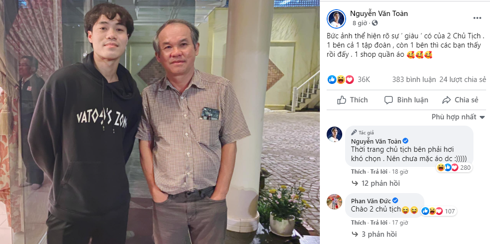 Tiền đạo Nguyễn Văn Toàn nhận được nhiều sự quan tâm khi chia sẻ bức ảnh chụp chung với bầu Đức tại tư dinh của Chủ tịch HAGL. Chân sút gốc Hải Dương còn hóm hỉnh viết chú thích: "Bức ảnh thể hiện rõ sự ‘giàu có' của 2 Chủ tịch. 1 bên cả 1 tập đoàn, còn 1 bên thì các bạn thấy rồi đấy: 1 shop quần áo".