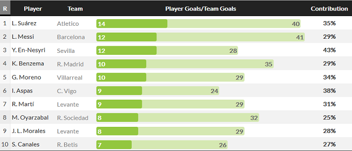 Nhưng Messi phải chia sẻ vị trí thứ hai với Youssef En-Nesyri. Ngôi sao đang đầu quân cho Sevilla cũng đã có 12 pha lập công tại La Liga mùa này.