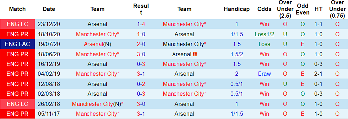 Thống kê 10 lần đối đầu gần nhất giữa Arsenal vs Man City
