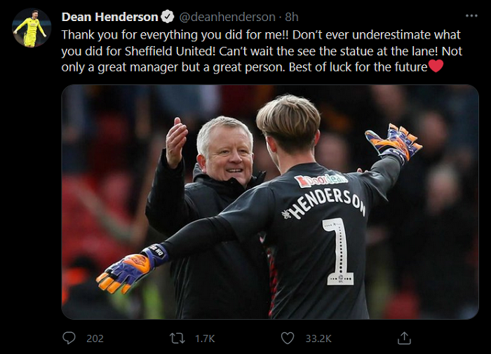 CLB Sheffield United chưa ra thông báo chính thức nhưng với độ chính xác từ những thông tin của Sky Sports, HLV Chris Wilder đã chắc chắn bị ‘trảm’. Thủ thành Dean Henderson cũng gián tiếp xác nhận điều này thông qua chia sẻ mới đây trên trang twitter cá nhân.