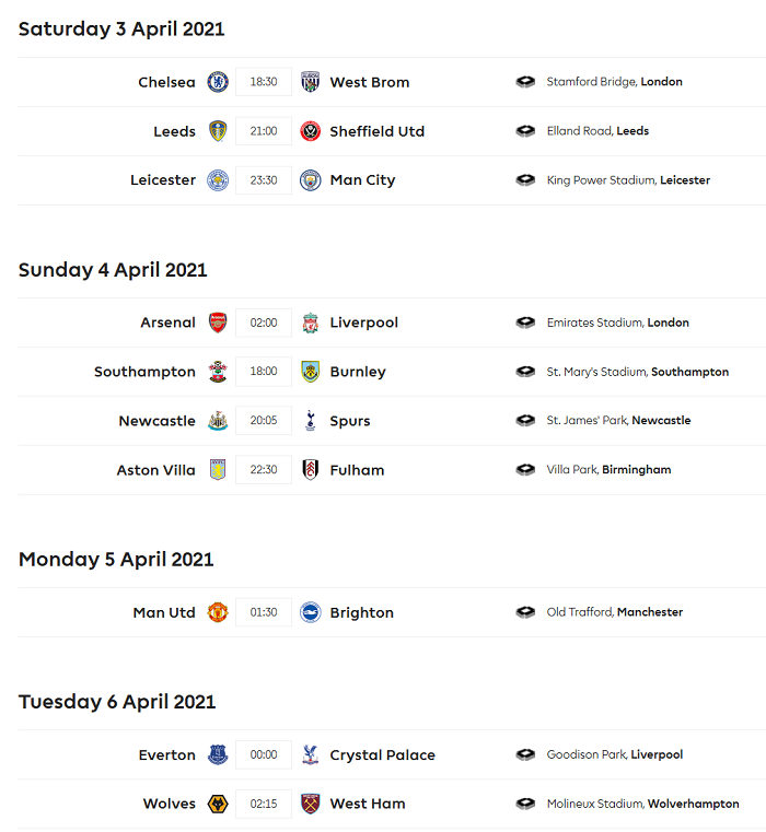 Trận đấu sớm nhất vòng 30 Ngoại hạng Anh 2020/21 là màn so tài giữa Chelsea vs West Brom. Chelsea sẽ tiếp đón West Brom vào lúc 18h30 ngày thứ Bảy (3/4) theo giờ Việt Nam. Trận cầu tâm điểm vòng 30 giữa Arsenal và Liverpool sẽ khởi tranh lúc 02h00 ngày Chủ nhật (4/4) cũng theo giờ Việt Nam.