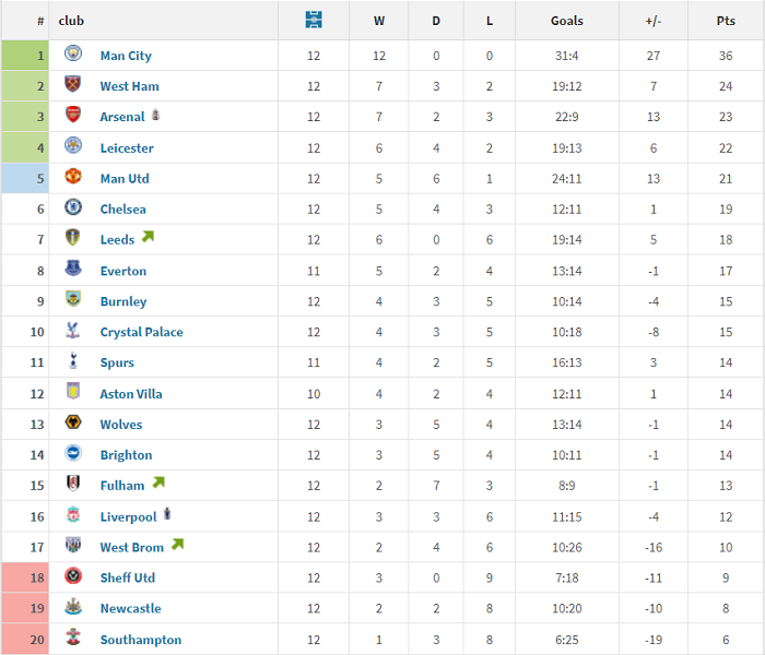 Bảng xếp hạng Ngoại hạng Anh 2020/21 kể từ Giáng sinh 2020