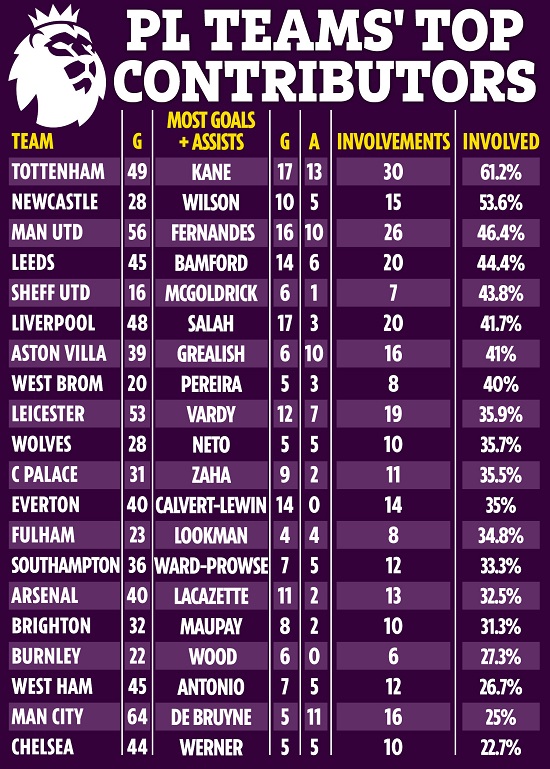 Chelsea là đội bóng không phụ thuộc quá nhiều vào các ngôi sao. Người có chỉ số cao nhất là Timo Werner - đã tham gia vào 10 bàn thắng, với 5 bàn thắng và 5 đường kiến tạo. Con số đó chiếm 22,7% tổng số bàn thắng của Chelsea ở mùa giải này. Tiếp đến là Man City với Kevin De Bruyne (25%).