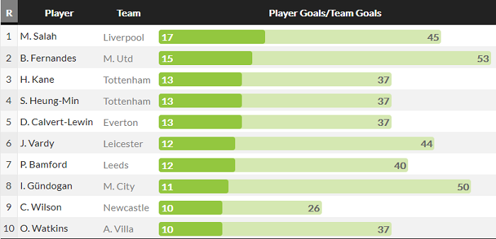 Ở vòng 25 này, một loạt ngôi sao thuộc nhóm dẫn đầu Top ghi bàn Ngoại hạng Anh 2020/21 cũng không lập công. Vì vậy, xếp sau Mohamed Salah và Bruno Fernandes là 3 cầu thủ đã có được 13 bàn: Harry Kane, Son Heung-min và Dominic Calvert-Lewin.
