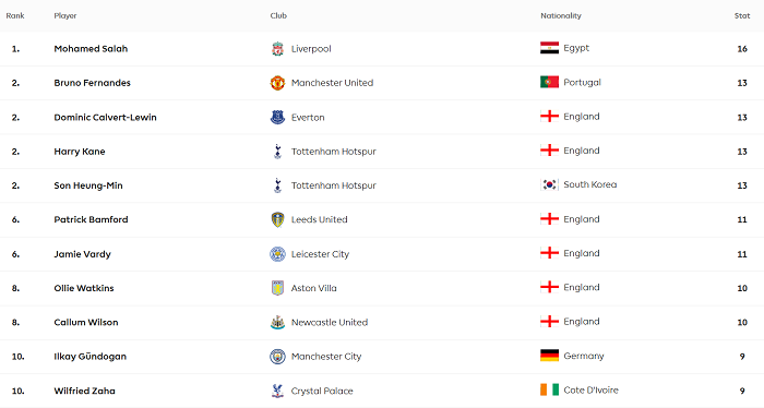 Theo sát Salah là 4 cầu thủ đã có 3 bàn ở Premier League mùa này. 4 ‘tay săn bàn’ cùng sở hữu vị trí thứ hai bao gồm: Harry Kane, Son Heung-min (cùng Tottenham), Bruno Fernandes (MU) và Dominic Calvert-Lewin (Everton).