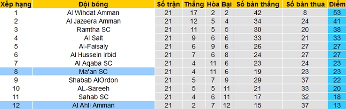Bảng xếp hạng giải VĐQG Jordan trước vòng 22