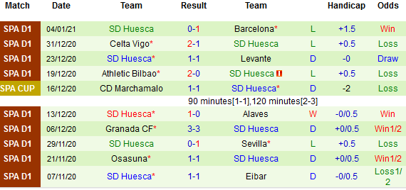 + Thống kê 10 trận gần nhất của Huesca