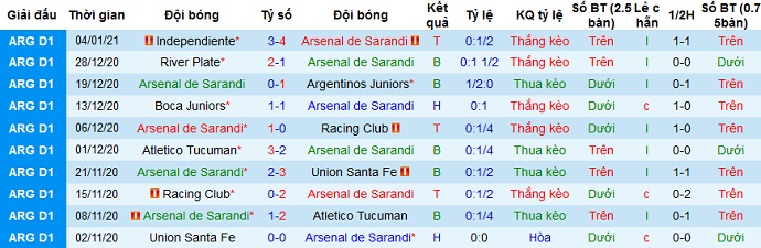 + Thống kê 10 trận gần nhất của Arsenal Sarandi