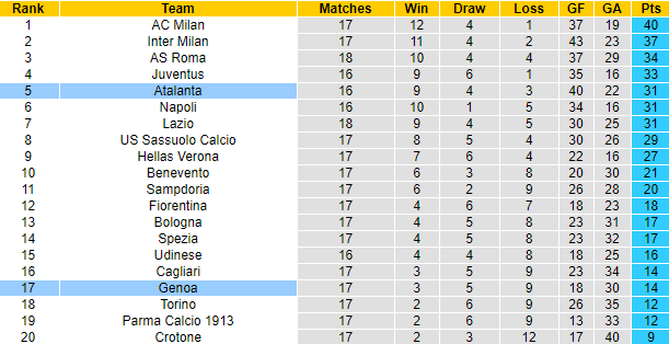 Trên bảng xếp hạng Serie A, Genoa đang xếp thứ 17 với 14 điểm sau 17 trận. Đối thủ của họ sau 16 trận đã giành được 31 điểm, xếp ở vị trí thứ 5. Điều đáng bàn là Atalanta đang thi đấu vào phom với 4 thắng lợi liên tiếp, xé lưới đối thủ 15 lần. Trên sân nhà, Atalanta toàn thắng với tỷ số cách biệt 5 trận liên tiếp gần đây.
