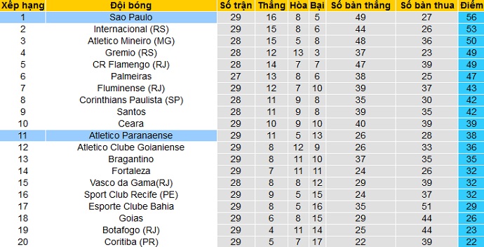 Trong khi đó São Paulo đang độc chiếm ngôi đầu của bảng xếp hạng với 56 điểm cũng sau 29 vòng đấu. Hiện tại São Paulo đang hơn đội thứ nhì Internacional 3 điểm và hơn 2 đội còn lại trong Top 4 cùng là 6 điểm.
