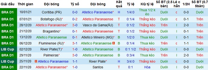+ Thống kê 10 trận gần nhất của Athletico-PR