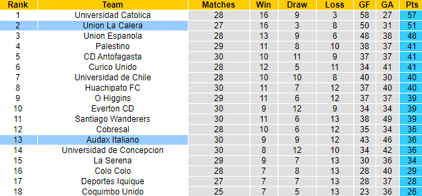 Union La Calera sau 27 trận tại giải VĐQG Chile mùa này đã giành được 51 điểm, xếp ở vị trí thứ 2 trên bảng xếp hạng. Trong khi đó sau 30 trận, Audax Italiano mới giành được 36 điểm, xếp sau đối thủ 11 bậc. Vì vậy ở trận đối đầu sắp tới, Union La Calera hoàn toàn xứng đáng được đánh giá cao vào khả năng giành chiến thắng.