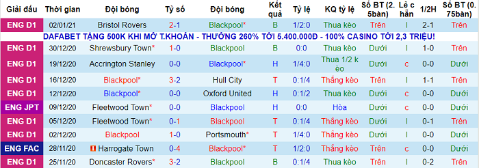 - Thống kê 10 trận gần nhất của Blackpool