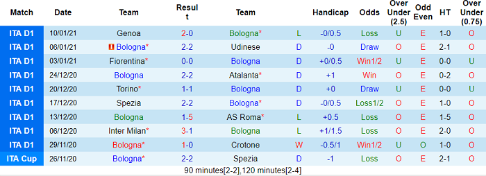 - Thống kê 10 trận gần nhất của Bologna