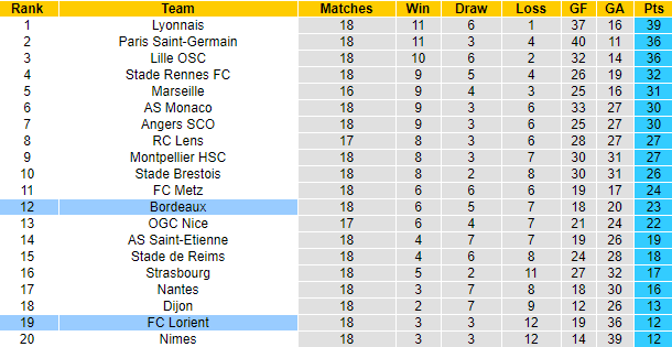 Trên bảng xếp hạng Ligue 1 lúc này, Bordeaux đang xếp ở vị trí thứ 12 với 23 điểm sau 18 trận. Với số trận tương tự, Lorient mới giành được 12 điểm, xếp ở vị trí thứ 2 từ dưới lên. Thành tích tốt hơn cùng lợi thế sân nhà, Bordeaux càng tỏ ra hứa hẹn vào khả năng giành chiến thắng trong cuộc so tài sắp tới.
