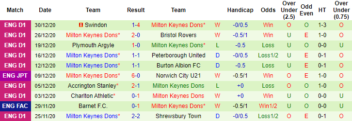 + Thống kê 10 trận gần nhất của Milton Keynes Dons