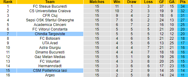Sau 15 vòng đấu tại giải VĐQG Romani mùa này, Chindia Targoviste giành 20 điểm, xếp ở vị trí thứ 7 trên bảng xếp hạng. Trong khi đó với số trận tương tự, Politehnica Iasi mới giành được 14 điểm, xếp sau đối thủ 8 bậc. Vì vậy ở trận đấu sắp tới, Chindia Targoviste hoàn toàn xứng đáng được đánh giá cao hơn đổi thủ khi có lợi thế sân nhà.
