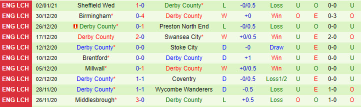 + Thống kê 10 trận gần nhất của Derby County