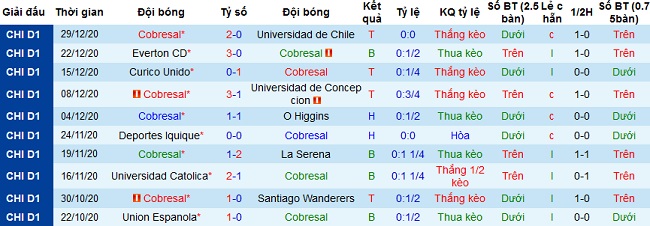 Thành tích của Cobresal cũng khá tốt khi ở 5 trận đấu gần đây đội bóng có được 3 trận thắng, 1 trận hòa và để thua 1 trận. Thành tích sân nhà của đội bóng cũng hoàn toàn tương tự nhưng đang bất bại ở 3 trận gần nhất tại đây với 2 trận thắng và 1 trận hòa.