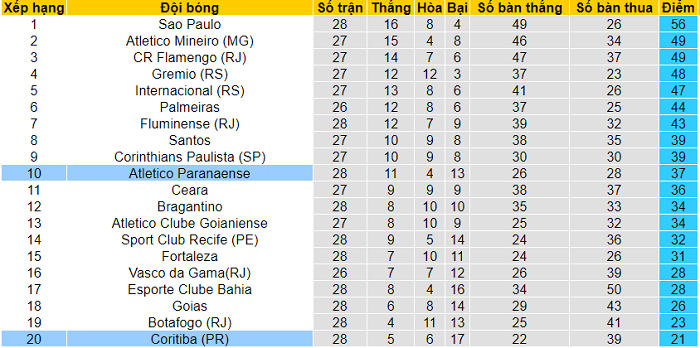 Bảng xếp hạng giải VĐQG Brazil sau vòng 28