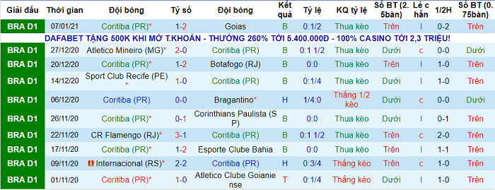 Việc Athletico PR chỉ chấp Coritiba 1/4:0 là điều bất ngờ nếu căn cứ vào phong độ hiện tại cũng như thành tích đối đầu gần đây của cả hai. Coritiba rõ ràng không phải là một sự lựa chọn đáng tin bởi họ là đội có tỷ lệ thắng kèo thấp nhất Serie A Brazil mùa này. Tỷ lệ thắng kèo của Coritiba chỉ ở mức 35.71%: thắng 10, hòa 2, thua 16.