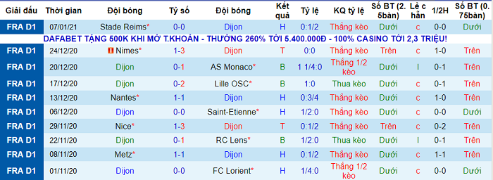 Khả năng Marseille đánh bại Dijon hứa hẹn xảy ra bởi Dijon thật sự ‘ngại’ việc thi đấu trên sân nhà. Dijon không thắng cả 9 trận sân nhà kể từ khi Ligue 1 mùa 2020/21 khởi tranh và thua 5 trong số này.