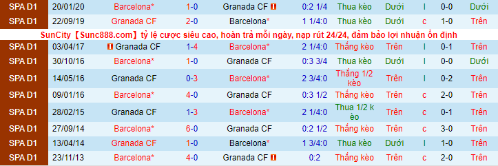 Trên sân khách, Barcelona cũng thể hiện bộ mặt tích cực khi toàn thắng 3 trận gần nhất, ghi 7 bàn. Trong lịch sử, Barcelona cũng luôn tỏ ra vượt trội trong các kèo đấu với Granada. Trong 8 lần chạm trán gần nhất, đội bóng xứ Catalan có được 7 chiến thắng và chỉ để thua 1 trận duy nhất.