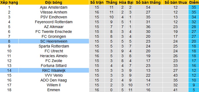Trong khi đó Waalwijk chỉ đang đứng ở vị trí thứ 14 trên bảng xếp hạng với 12 điểm cũng sau 15 vòng đấu. Khả năng phải đối mặt với cuộc chiến trụ hạng đang hiển hiện trước mắt khi Waalwijk chỉ đang đứng trên nhóm các đội cầm đèn đỏ 2 bậc với khoảng cách chỉ là 2 điểm.