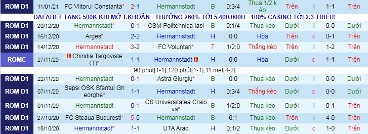 + Thống kê 10 trận gần nhất của Hermannstadt