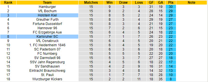 Tại vòng 16 giải hạng 2 Đức, Holstein Kiel được trở về sân nhà tiếp đón Karlsruher và đây là cơ hội tốt để họ tìm lại cảm giác chiến thắng. Niềm tin của đội chủ sân Holstein-Stadion càng gia tăng khi họ có được đà tâm lý hứng khởi.