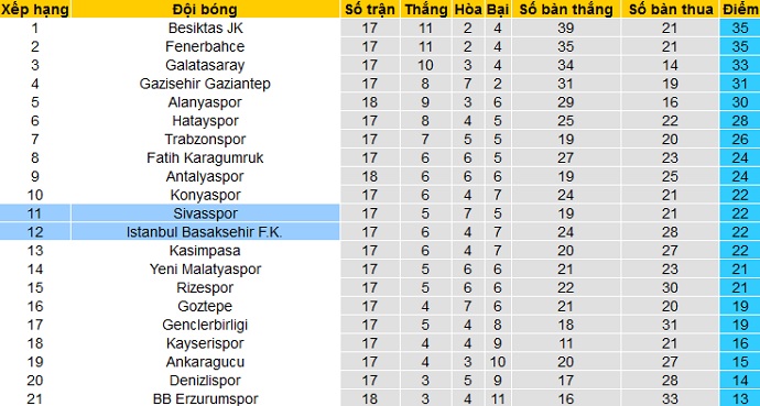 Istanbul Basaksehir và Sivasspor hiện đang đứng sát nhau trên bảng xếp hạng của giải vô địch quốc gia Thổ Nhĩ Kỳ. Có cùng 22 điểm sau 17 vòng đấu, Sivasspor tạm xếp trên đối thủ ở vị trí thứ 11 do hơn về hiệu số bàn thắng.