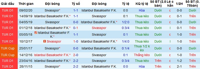 + Lịch sử đối đầu Istanbul Basaksehir vs Sivasspor