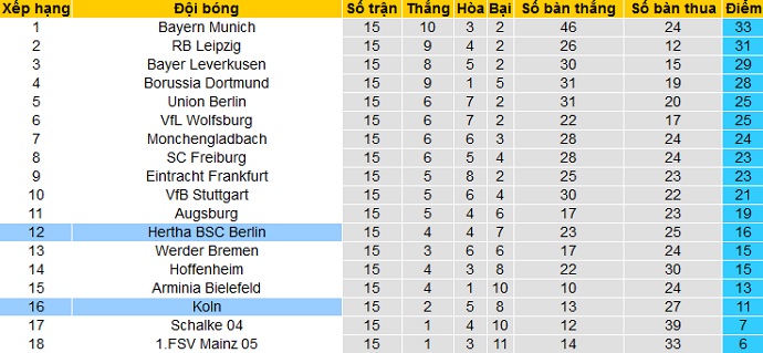 Bảng xếp hạng giải VĐQG Đức sau vòng 15