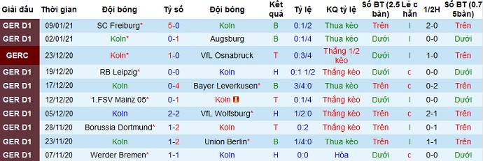 + Thống kê 10 trận gần nhất của Köln