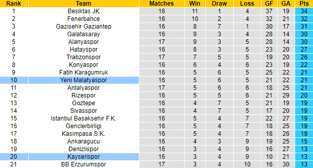 Đối thủ của Kayserispor là Yeni Malatyaspor sau 16 trận đã giành được 21 điểm, xếp thứ 10 trên bảng xếp hạng. 11 trận vừa qua tính trên mọi đấu trường, Yeni Malatyaspor bất bại tới 9 lần. Trong vòng 6 lần đối đầu Kayserispor trước đây, Yeni Malatyaspor thắng 3, hòa 2 và chỉ để thua 1 trận. Ngoài ra đội khách còn có lợi thế về lực lượng khi chủ nhà Kayserispor mất 5 trụ cột vì chấn thương và án treo giò.