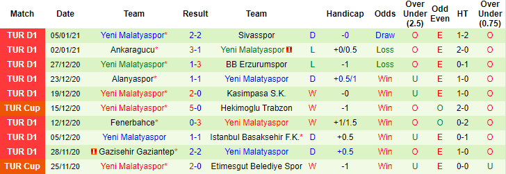 + Thống kê 10 trận gần nhất của Yeni Malatyaspor