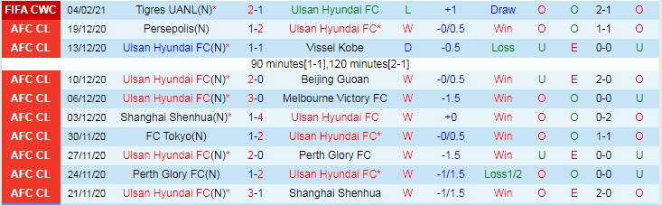 + Thống kê 10 trận gần nhất của Ulsan