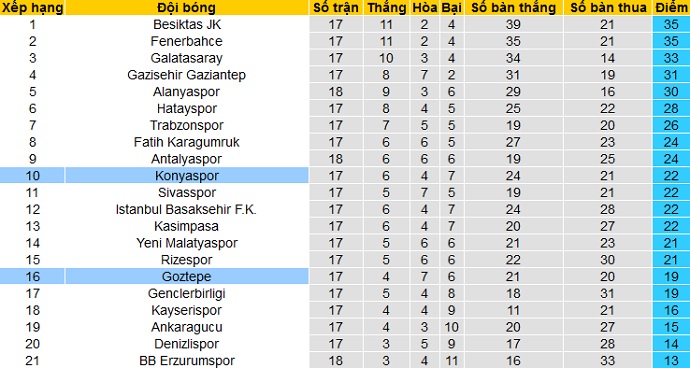Bảng xếp hạng giải VĐQG Thổ Nhĩ Kỳ trước vòng 18
