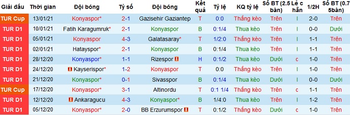 Trong 5 trận gần đây Konyaspor có được 2 trận thắng, 1 trận hòa và 2 trận thua, tính cả trận thắng tại cúp quốc gia. Trên sân nhà thành tích của đội bóng có phần tốt hơn với 3 trận thắng, 1 trận hòa và 1 trận thua.