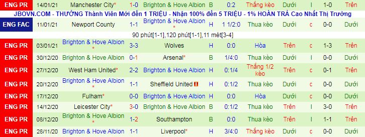 + Thống kê 10 trận gần nhất của Brighton