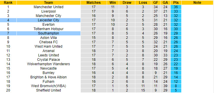 Sau 17 lượt trận, Leicester có được 32 điểm và đứng ở vị trí thứ thứ 4 trên BXH. Nhưng đây chưa phải thời điểm thầy trò HLV Rodgers được phép chủ quan bởi họ cũng chỉ hơn đội xếp thứ 5 Everton đúng hiệu số bàn thắng thua.