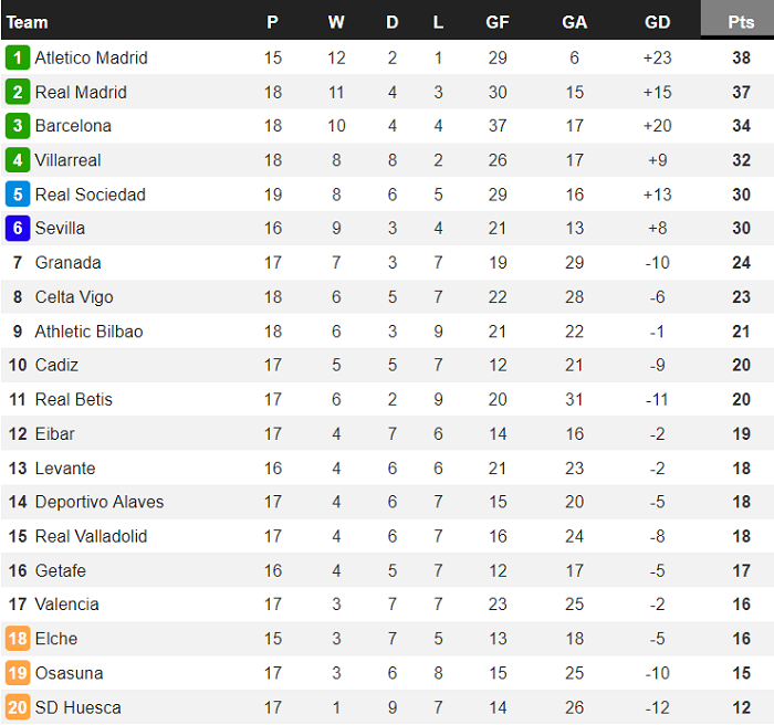 Bảng xếp hạng La Liga mới nhất