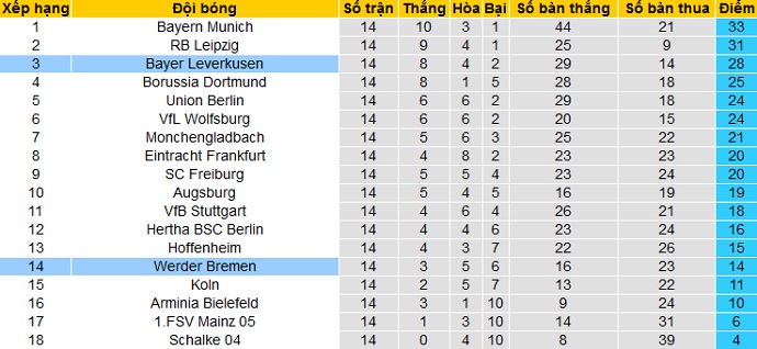 Trong khi đó tình cảnh của Werder Bremen lại hoàn toàn trái ngược so với đối thủ. Hiện tại đội bóng đang đứng thứ 14 trên bảng xếp hạng với 14 điểm cũng sau 14 vòng đấu. Werder Bremen chỉ đang đứng trên nhóm các đội cầm đèn đỏ có 2 bậc với khoảng cách chỉ là 2 điểm.
